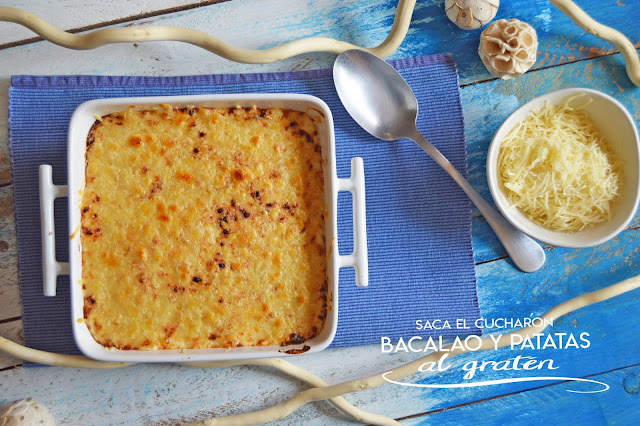 Vertemos la salsa sobre la fuente del bacalao y las patatas, y espolvoreamos con el queso rallado por encima.